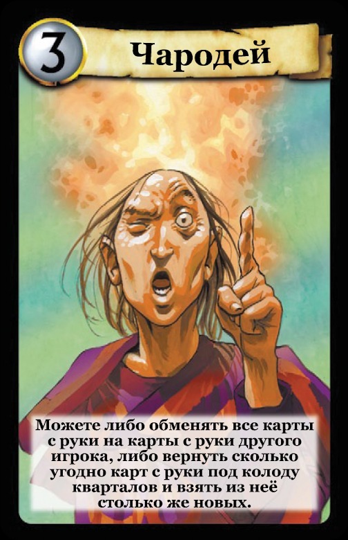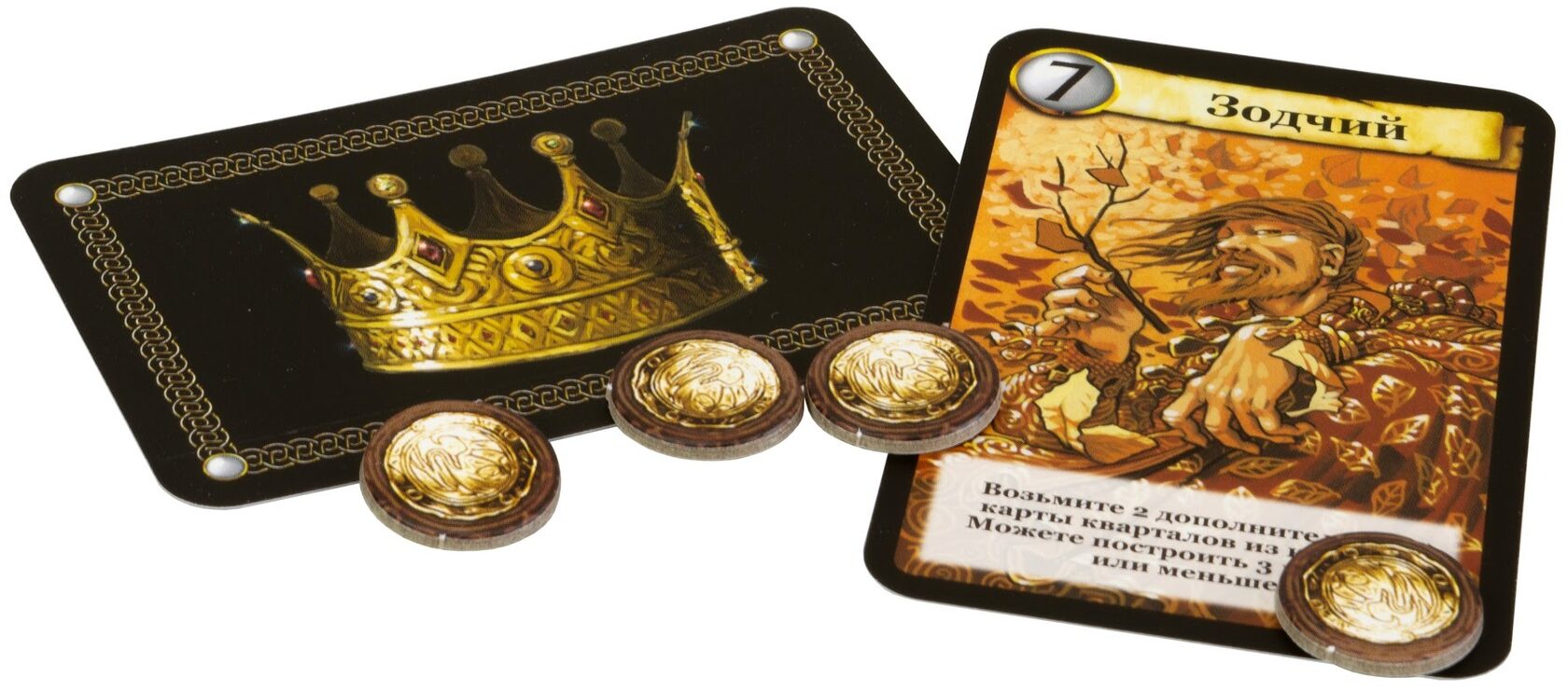 Каждый персонаж обладает собственным уникальным свойством, позволяя выбравшему его игроку выполнить определенные действия. Ассасин убивает одного персонажа, лишая его права хода, вор похищает деньги, чародей позволяет менять свои карты еще не построенных кварталов на карты кварталов другого участника. Король позволяет получать дополнительные монеты за каждый построенный дворцовый квартал желтого цвета, а так же дает право начать следующий ход первым. Здания епископа защищены от атак кондотьера, а синие религиозные кварталы приносят ему дополнительный доход. Купец получает один золотой и дополнительный доход за каждый зеленый торговый квартал. Зодчий берет две новых карты кварталов и может построить до трех зданий за один ход. И, наконец, кондотьер получает золото за каждый красный военный квартал и может разрушать чужие постройки, выплатив за это на одну монету меньше их стоимости постройки. То есть здания ценой в один золотой будут желанной добычей кондотьера, так как будут разрушаться бесплатно. Каждый ход персонажи будут меняться, предоставляя игрокам новые возможности.