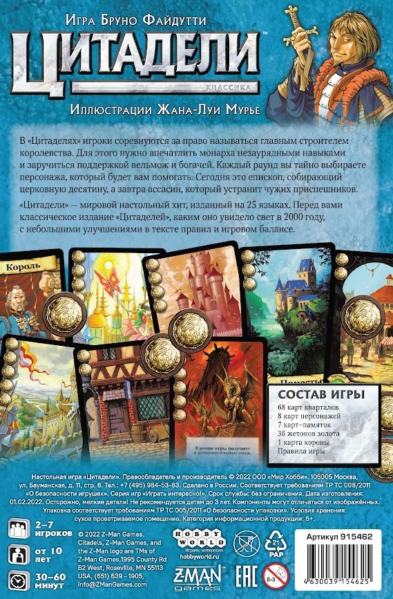Основу игры составляют карты кварталов и персонажей. Карты кварталов это постройки, которые необходимо возводить игрокам для победы. Кварталы различаются стоимостью, указанной в левом верхнем углу и цветом. Цвета кварталов привязаны к способностям некоторых персонажей, о которых я расскажу позже.