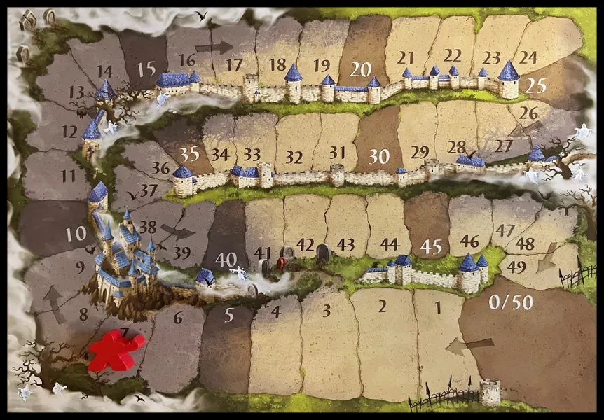«Туман над замком Каркассонн» — кооперативная версия игры Carcassonne с укладкой тайлов. Работая вместе, вы размещаете тайлы, пытаясь остановить распространение призраков — сдерживать земли с привидениями на кладбищах и использовать замки с привидениями в своих интересах. Если слишком много призраков разбросано по земле или вы набрали слишком мало очков, когда плитки закончатся, вы проиграете игру. Если вам удастся выжить три дня, вы можете увеличить уровень сложности игры.